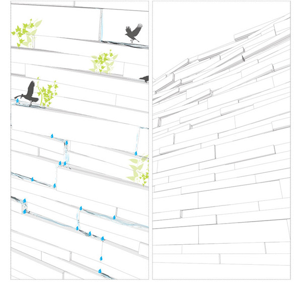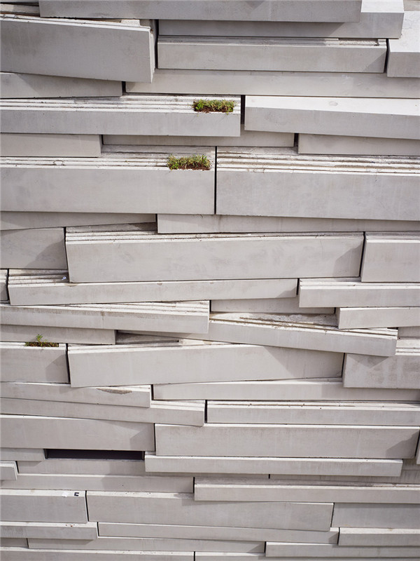 這個項目的“樹皮”——生態(tài)墻是由預(yù)制混凝土塊做成的。這些混凝土塊呈現(xiàn)了兩種不同材質(zhì)。其可見的一面是光滑的,打磨過的,它反射著光線。而另一面則是肋狀的,并且具有粗糙和凹凸不平的質(zhì)感,整個融為一面單墻。這兩種不同的表面有助于把水流引導(dǎo)向混凝土塊的一面,因此避免水順著可見面流下來而使其過早老化。兩種材質(zhì)的對比不但強調(diào)了立面的深度,也增強了其浮雕效果。在較低的部分,大概在兩米的高度上,獨立式墻體進(jìn)行了平滑處理或者向外傾斜,已防止外來者包括一些潛在的野獸進(jìn)入。墻體側(cè)面上的凹槽能讓植被在其表面生長;而一小較小的凹陷和褶皺則是提供給動物的,例如很適合一些不同的鳥類在這里筑巢。