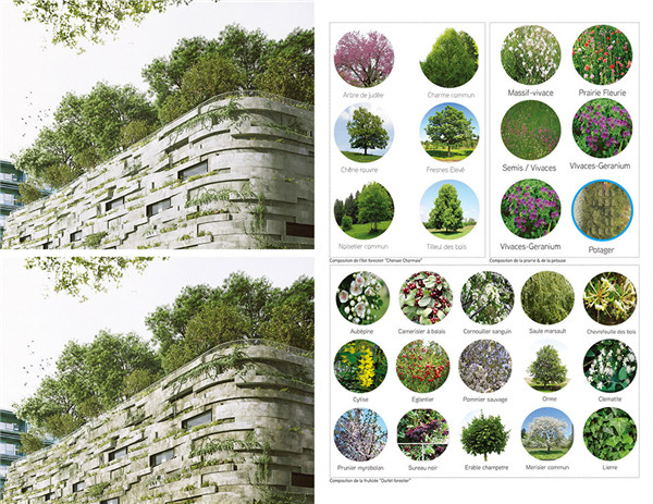 高于體育館上空的十二米之處的屋頂是一個真正的空中花園。這里同時也是三層植被的家園。中生代植物草原種植于土壤里的五十厘米處,一條灌木帶和一個林地島種植于土壤里的一米深處。由植物群創造的生態走廊的連續性使不同物種之間獲得了自然交流。這個架空花園有兩個功能:其一,對于墻體以及花園自己的動物群來說,這里都提供了豐富的供給,從而確保了生物多樣性的延續。其二,花園也改善了北部辦公樓以及南部公寓樓里的生活環境,提供了一個空中景觀。