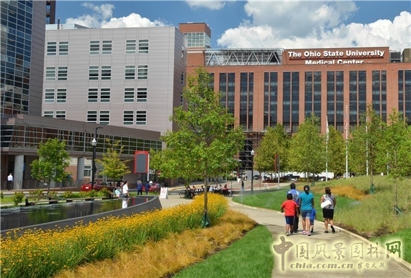 改造后的公園重新利用了原有的平坦草坪,將其打造成為了一塊用于休憩與紀念的空間。捐贈者噴泉則以雕刻的地形、青石鋪就的道路及天然植物為構架,為患者、醫護工作者及游人營造了沉思的氛圍。