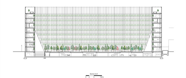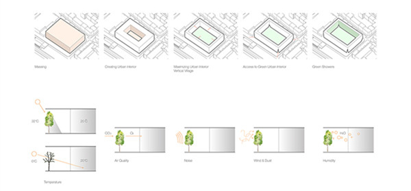 設(shè)計提出了一個帶有中心花園和垂直花園的方形框架,綠色內(nèi)部空間從天空流動到地面,創(chuàng)造出不同的空間體驗。每個角都設(shè)計了兩個斜切,來邀請周圍的每一個人。垂直結(jié)構(gòu)的每一層都有不同居住形式的公寓和靠近交通中心的公共空間,以此來鼓勵不同人之間的交流。