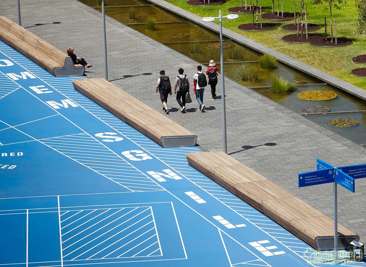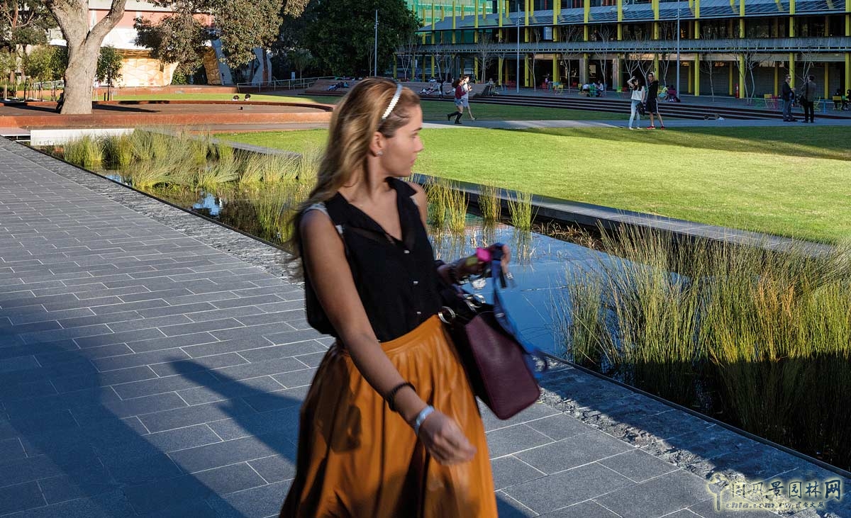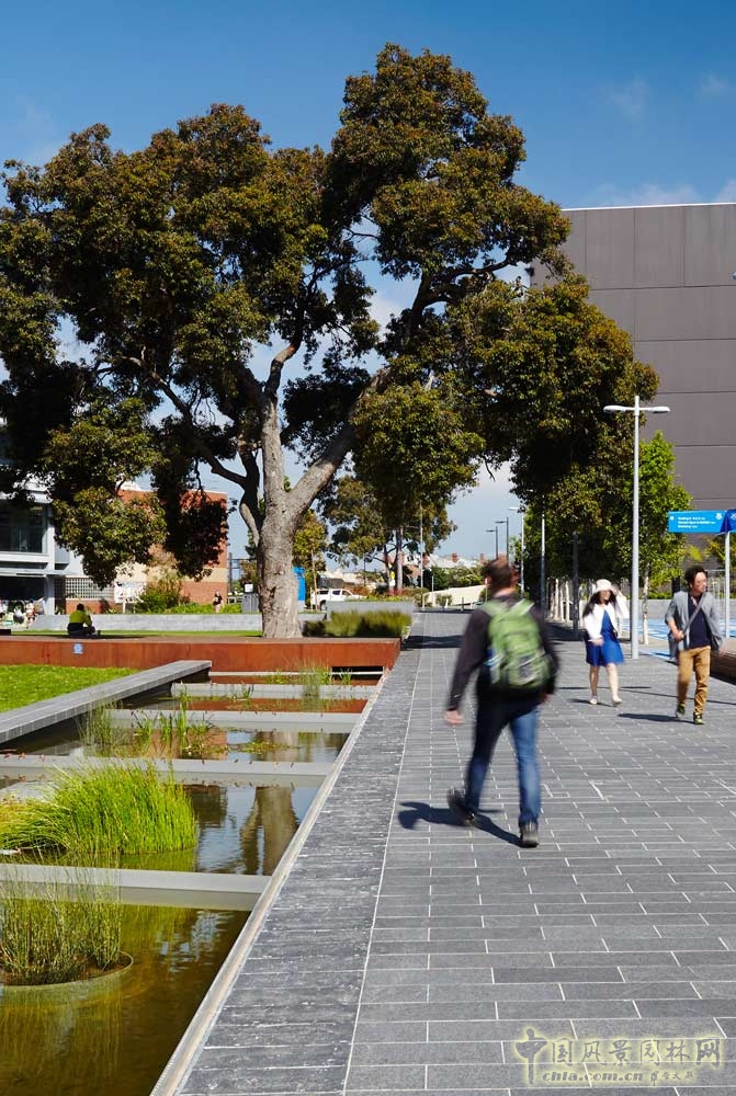 中央水景進(jìn)行了雨水處理和回收利用,展現(xiàn)出莫納什大學(xué)在參考原先濕地環(huán)境系統(tǒng)后,對水敏感城市進(jìn)行的開創(chuàng)性研究。