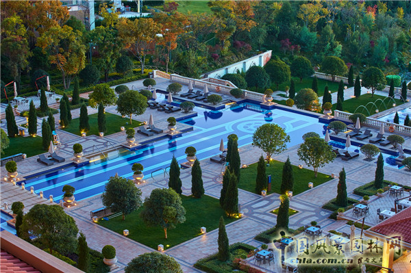 在完成山水骨架的規(guī)劃之后,才進行建筑等各種功能空間的規(guī)劃與設計。背山面水,在山體與湖面之間的坡地上,規(guī)劃出了“一個中心兩個側翼”,以高爾夫球場景觀為側翼形成一個面向湖面的半圍合空間,而酒店則選址于半內向空間之中。抵達酒店,則必須穿過高爾夫球場,這里既是酒店的外圍功能空間,更是形成酒店的另一類特色景觀。而坐落于中心位置的酒店主體建筑,為使其達成“銜遠山、吞撫仙”之勢,酒店泳池區(qū)軸線為主體進行設計,從背山的酒店主體建筑一直延伸至湖畔,形成山湖之間的一衣帶水之勢。遐邇之間,景觀的空間層次豐富多變,形成不同的情緒體驗空間。