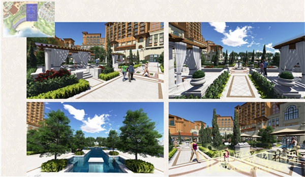 景觀設計于室外部分則充分挖掘各種場地資源,不拘一格營造出各種體驗式空間:浪漫婚慶區,主要由特色廣場、陽光草地、浪漫花海、特色花池以及婚慶廣場等組成,活動空間較大,人們可以在此舉辦婚禮、婚宴,高貴又不失浪漫、野趣;陽光沙灘區,“近水樓臺先得月”,充分挖掘撫仙湖畔資源,營造了由湖邊觀景臺、SPA平臺、湖畔小亭以及沙灘等所組成的湖畔游樂區域。