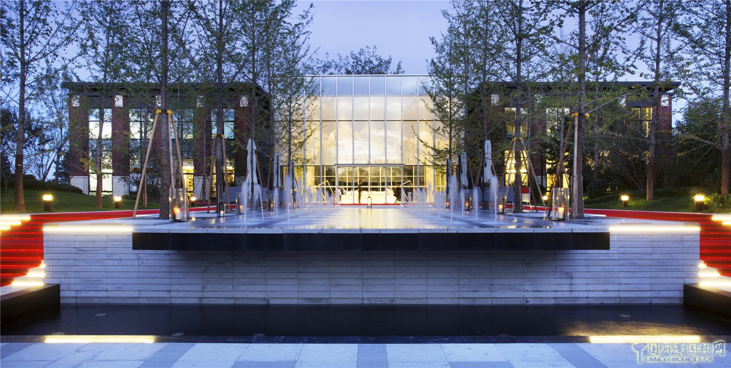 突破黑色光面水池的慣常做法,以石材的線條鋪裝和鏡面水的應用將建筑呈現,建筑在景觀中得以完美延伸,渾然一體,互為映襯,靈感來源正是汲取傳統借景手法。