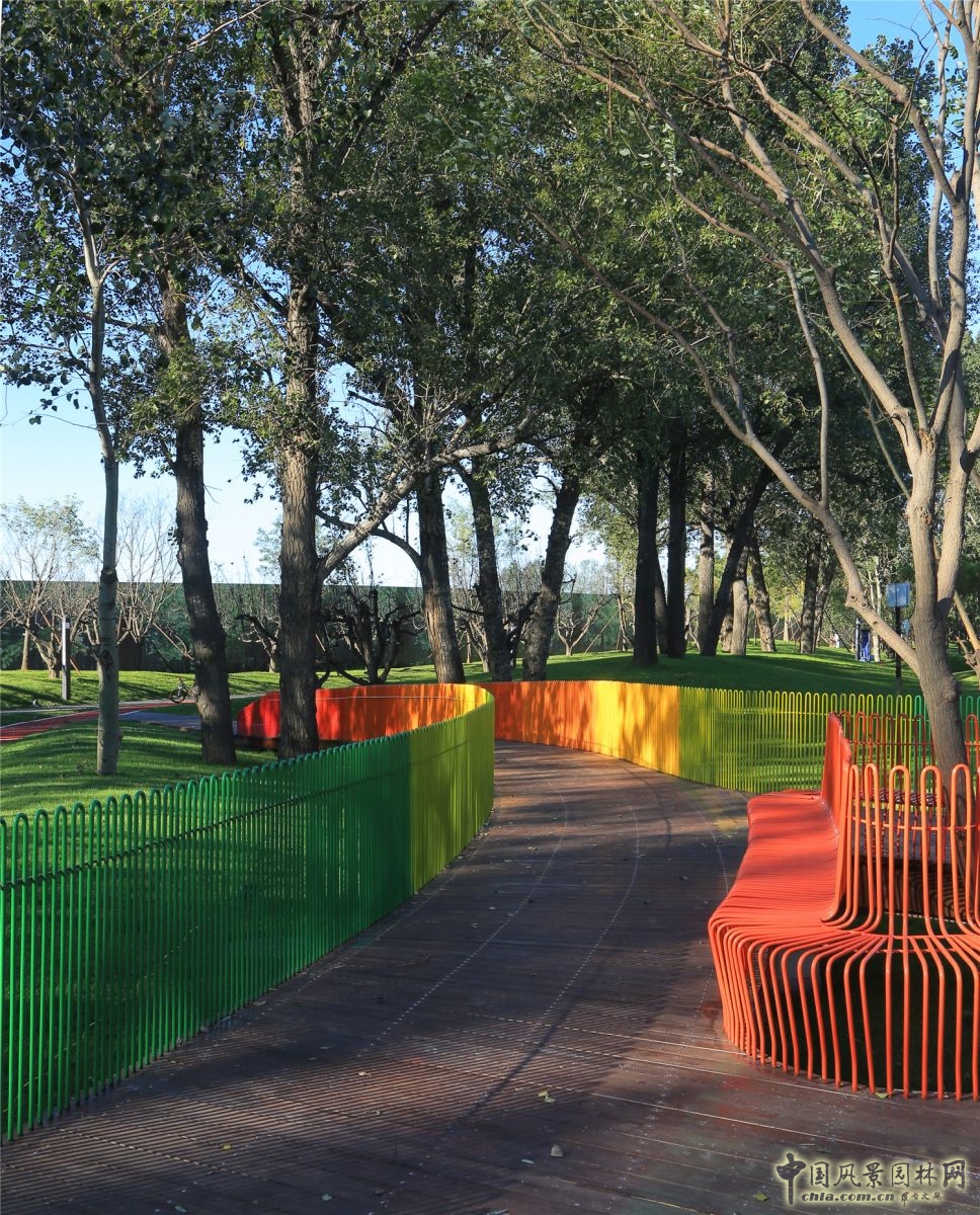 為最大限度保留良好的原生綠化,團隊借勢以曲線路銜接,用限定視線的方式打破人工樹陣;用設計彌補高低起伏的地勢差,形成整個橋體波動起伏的韻律感和動感;欄桿的彩虹色恰好也彌補了北京冬日漫長無色彩的遺憾。動感又極具色彩的彩虹橋讓景觀與居者產生了潛移默化的化學反應。