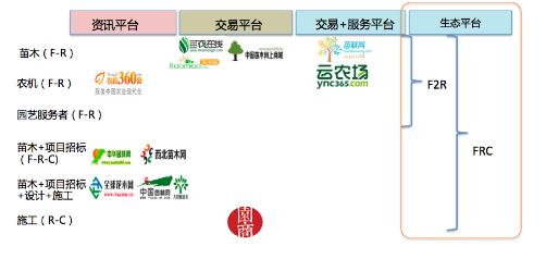 為了切實解決這些痛點,在考量企業實力的基礎上,我們確定了園林FRC生態平臺的模式。該平臺將整合產業鏈各端,包括苗農、苗農經紀人、勞工以及園林施工企業。平臺最終將提供資金流、物流、信息流全方位解決方案,前期將以交易功能為主。