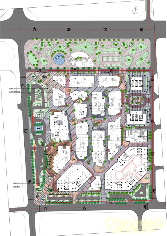項目充分考慮到基地與周邊道路、建筑的關系,發揮本地塊的優勢資源,提出“五區、四巷、六點”的景觀結構布局,創造舒適合理的生活空間環境。