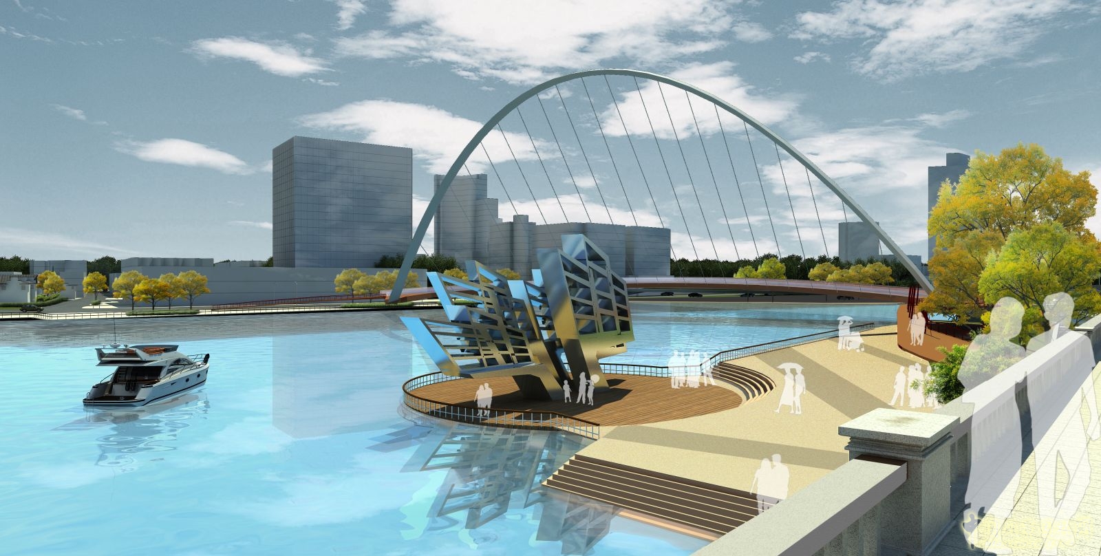 海上絲路起航點主題雕塑——船帆造型的雕塑成為水面上的視覺標識點,強化了寧波作為中國海上絲綢之路起點的重要歷史意義。并與江夏橋新人行橋形成新的城市空間意向。