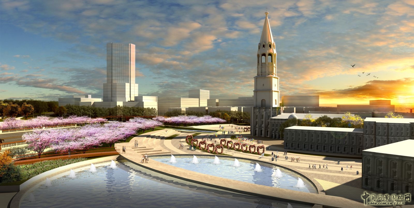 教堂片區:以天主教堂為核心,布置環形廣場,圓形靜水面倒映著夕陽下的教堂,春季的櫻花環繞著廣場,營造出浪漫的婚慶氛圍。