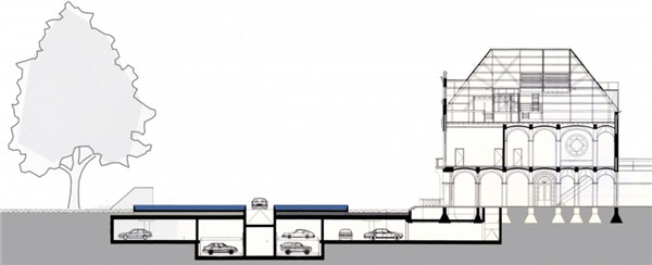 Voorhuis內(nèi)60套面積不一的公寓已經(jīng)設計完成。與每間公寓配套的兩個停車位需要安排在建筑的附近。最佳的解決方案即是在Voorhuis的前方設置地下停車場。設計師在停車場的上方設計了一座裝飾性的水池,主建筑最具特點的正立面由于它的存在而被加強。