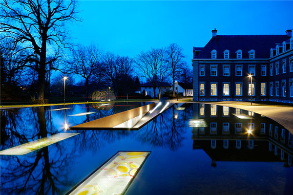 地下車庫(kù)的入口巧妙地、無(wú)形地將池塘一分為二。橢圓形的水池由銹蝕鋼板圍合而成,水面面積730㎡,水深60cm。池內(nèi)的采光井可以將自然光線引入地下車庫(kù)。天窗使用彩色玻璃板,每一扇都是一件獨(dú)立的藝術(shù)品。到了晚上,從地下車庫(kù)透上來的光為庭院營(yíng)造出別致的空間氛圍。此外,水池內(nèi)設(shè)置有特制的噴泉,間歇性開啟的時(shí)候會(huì)在水面上形成氣泡,讓這道景觀平和又有活力。