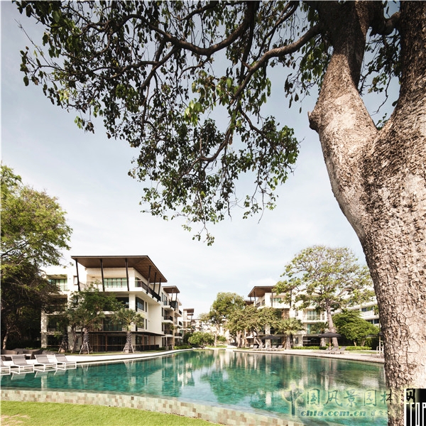 為了更好地實現委托方的期望,設計師摒棄了傳統的獨立花園結合水池的設計手法,大膽設計了一個長度為230米的水池,并沿水池的邊界設置系列花園。該設計的意義不僅在于對住宅項目市場價值的提升,更在于對古木進行保護的人文價值的體現。