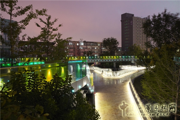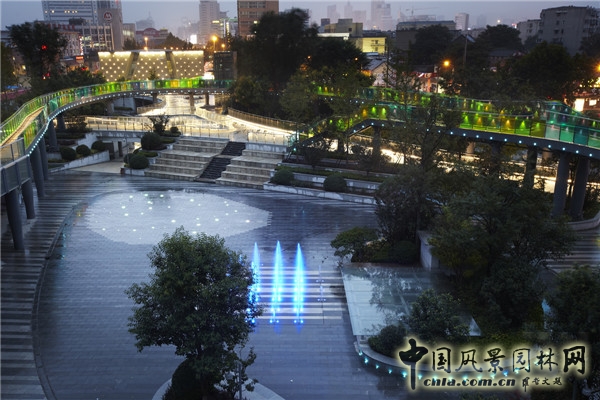 設(shè)計(jì)師大膽地將公園的地形梳理慢慢抬起,連接上一條6 米高,300 米長(zhǎng)的景觀廊橋,將散落的建筑單體聯(lián)系到一起,打破了空間上的局限性,將各個(gè)商業(yè)建筑串聯(lián)起來,并形成了一個(gè)商業(yè)內(nèi)庭廣場(chǎng),供游人休憩及商家組織活動(dòng)。