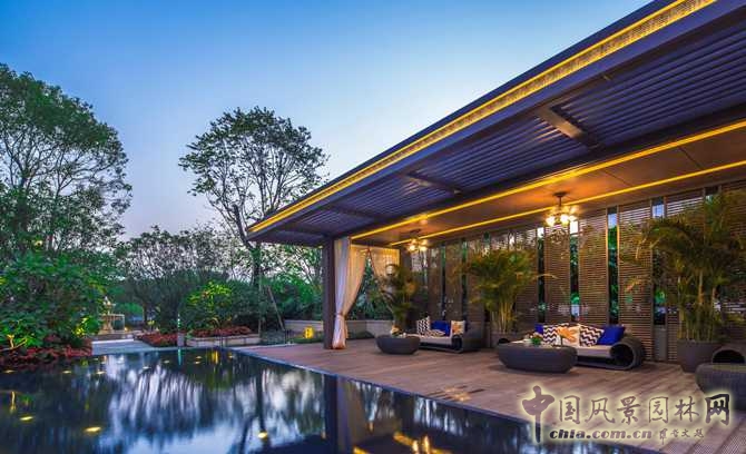 林蔭花海的夾道之中,竟藏有驚喜:木質構架所意向的亭臺,以及咫尺之外的觀景水面。將亭臺樓榭水環繞的古典意境用現代手法進行全新演繹。同時通過一些軟裝對空間進行修飾,使景觀別具浪漫風味。同時,情緒突兀的被放開,視線被景觀軸線不經意引向一側的樣板房庭院,暗生翹首期盼的心結。