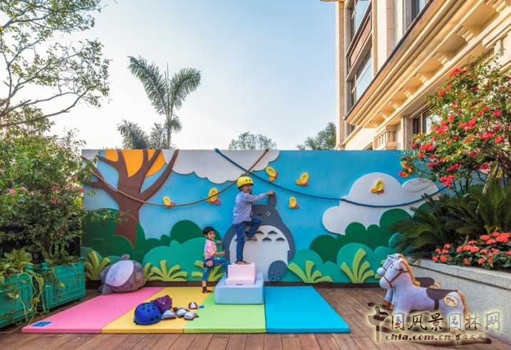 所以景觀將北庭院延伸室內老人房,設置老人休閑空間,漫進綠籬的開花喬木與爬滿植物的木格柵,讓休閑空間更加私密、圍合。南庭院設置兒童空間以及可看護孩子玩樂的女主人下午茶空間,參考室內女主人工作室的配套用色,將繽紛色彩帶到室外空間,綠籬、格柵、花木搭配繽紛的英式下午茶更加浪漫、有情調。西側設置兒童空間,首創3D立體卡通攀爬墻,顛覆枯燥的小石頭攀爬墻,通過繽紛的龍貓形象提高孩子們的喜好的程度。為兒童活動提供更多的可能性。