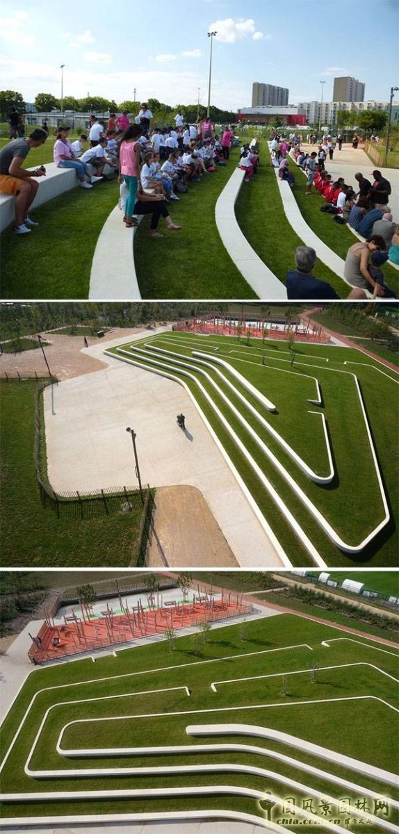 面對游樂場和霧池,有一片綠色階梯式的地形,人們可以在這里觀察孩子們游戲或者躺在草坪上曬太陽。幾棵孤立的樹木可以為人們提供陰涼,而且還不會覆蓋場地有趣的形狀。
