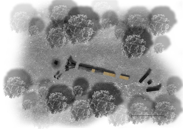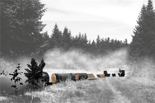 這是一個雕刻后的樹干,部分被切除后展現出了內部的材料,可以用來進行未來的建造。可以看到樹樁和樹根,這棵樹干被分成各個部分展現了木材的五種模式,同時表面經過了微微燒灼。這棵年輕的大樹好像還在繼續生長,沒有倒下。