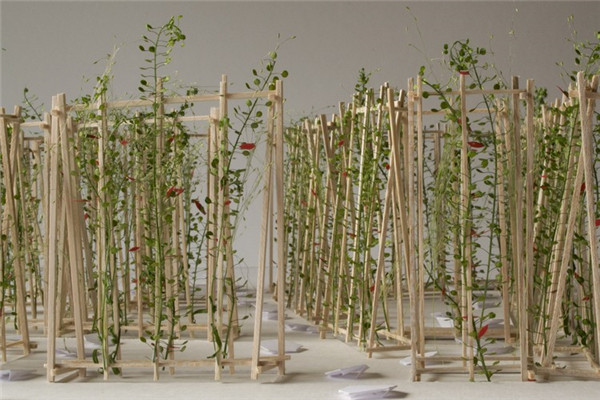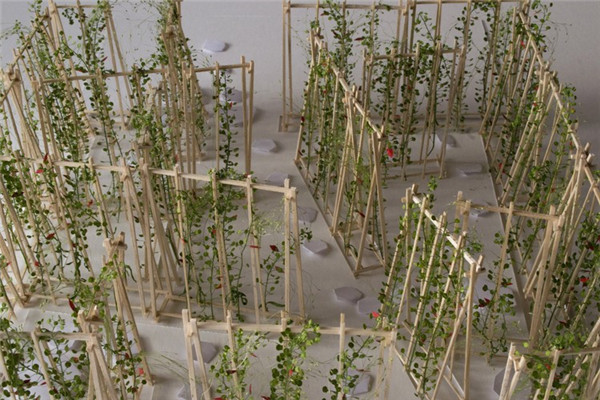 建筑是一個(gè)被花環(huán)繞的綠色墓地。你可以從陡峭地面上覆蓋的小石頭上進(jìn)入。進(jìn)入之后,你會(huì)感到輕質(zhì)木架上的豆子形成了道路。墻壁劃分了空間,成為了一系列小的隱藏公園,各自獨(dú)立。這個(gè)蠶繭般的建筑很適合玩躲貓貓的游戲。很多地方看起來(lái)十分隱蔽、不可到達(dá)。