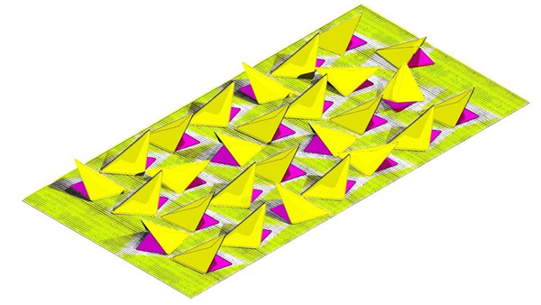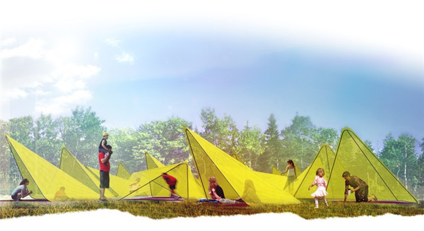 每一個(gè)結(jié)構(gòu)都朝向兩個(gè)方向,與太陽(yáng)的方位相呼應(yīng),提供了不同的視野和來(lái)自不同方向的道路。整體的布局就像是魚(yú)群或是鳥(niǎo)群那樣,雖然各自方向不同但是形成了一個(gè)整體。稻草般輕盈的結(jié)構(gòu)和亮黃色的表面讓人想到了盛開(kāi)的鮮花,與周圍綠色的景觀和藍(lán)色的天空形成了對(duì)比。
