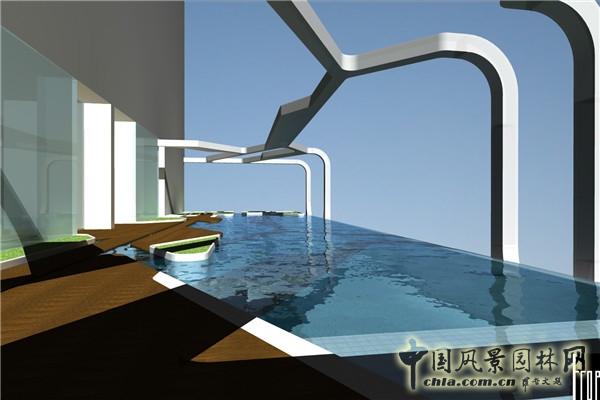 在曼谷,“空中泳池”已經多到不會讓人因其位置獨特而感到新奇,因此設計師必須通過景觀的營造來使其擺脫千篇一律的命運。該項目中的泳池的與眾不同之處就在于其上方的“骨架”結構。“骨架”的設計使得泳池與整個公寓大樓及入口處的山丘線條巧妙地融為一體,相輔相成。