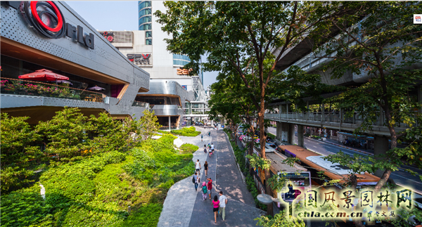 除了植物景觀外,其他的地區(qū)僅僅是為了滿足行人的需要。平直而干凈的硬質(zhì)鋪裝為行人(包括殘疾人)帶來簡潔的步行區(qū)。原來的機動車停車場被改造成開闊而舒適的步行區(qū)。街道兩旁的行道樹被保留下來,在曼谷烈日炎炎的夏日為步行道遮陰。而改造前的步行區(qū)沒有樹木遮蔽,人們上下班從火車軌道上的高架通道穿行。露天的步道除了鋼結(jié)構(gòu)的硬質(zhì)路面基本沒有觀賞性,步道環(huán)境枯燥而令人沮喪。新步道使行人走到建筑的第一層,近距離的接觸自然。這樣一來,人們便能與周圍的環(huán)境親密接觸。