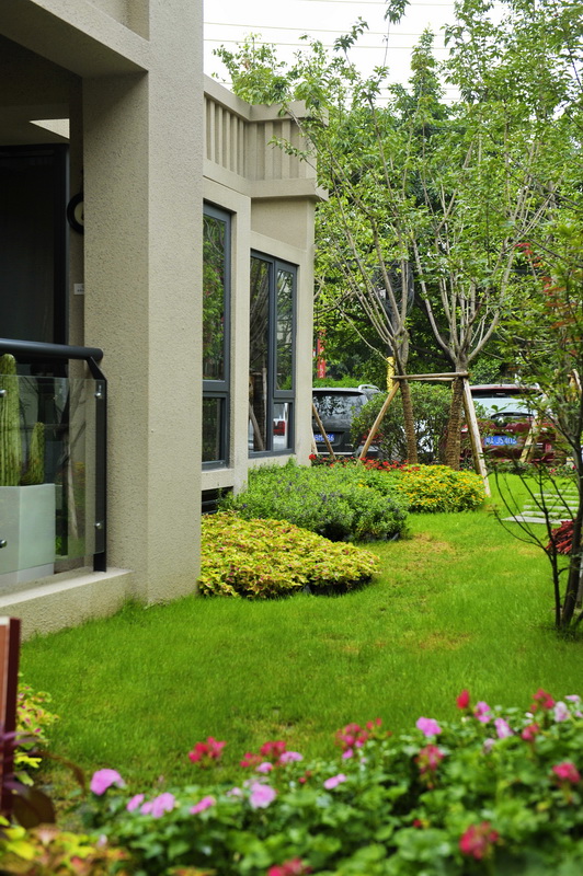 2、中庭月季花園:運(yùn)用法式園林規(guī)整式園林表現(xiàn)手法,花園兩邊列植整形天竺桂,對(duì)植紅葉李和高桿桂花,栽植雀舌黃楊綠籬和茶花綠籬與四周歐式庭院燈,坐凳的完美融合增加了整體圍合感。中間黑色雨花石小徑把月季花園劃分的自然清新。花園進(jìn)售樓部的廊架上面纏滿三角梅藤,廊架兩邊也使用三角梅,當(dāng)鮮花盛開(kāi)是給人以浪漫,熱烈的感覺(jué),讓人沉醉在這花海間。