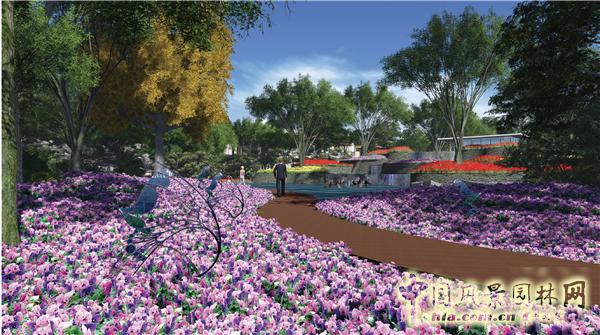 穿過入口處的濃蔭密林來到開敞的疊溪花海,涌動的溪流歡快的跌水浪漫的花海給人一種豁然開朗的感覺,旋律漸漸進入高潮,來到售場前庭,鏡面水景配合著主題雕塑給人以尊貴、高尚、大氣的感覺,出售樓部通過曲徑通幽的樹陣通道內(nèi)聚空間到了開敞的疏林花境,以跌溪為背景色彩繽紛的花穿梭于林下,像色彩跳躍音符奏響林中之歌充滿著濃郁的浪漫情懷。