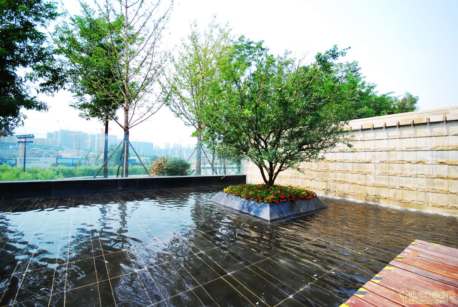 廣場正南是個過道廊架,廊架南邊是又是個小廣場,廣場中間有個小花壇種滿了紫色薰衣草仿佛進入了夢幻一樣的仙境,廣場再往南是個200㎡的大水景,水景兩側是跌水水系,中央是個高臺形勢的無邊水系,水景中間有兩個樹池里面種的石榴樹,到了秋天樹上掛滿了石榴像一個個小燈籠,不僅點亮了人們的心靈還給小區營造了豐收,喜慶的氛圍。水景南側的小區圍墻采用可觀景玻璃圍墻,透過圍墻可看見曲江池及寒窯遺址景區,看見下方熱鬧的人群,優美的景色。