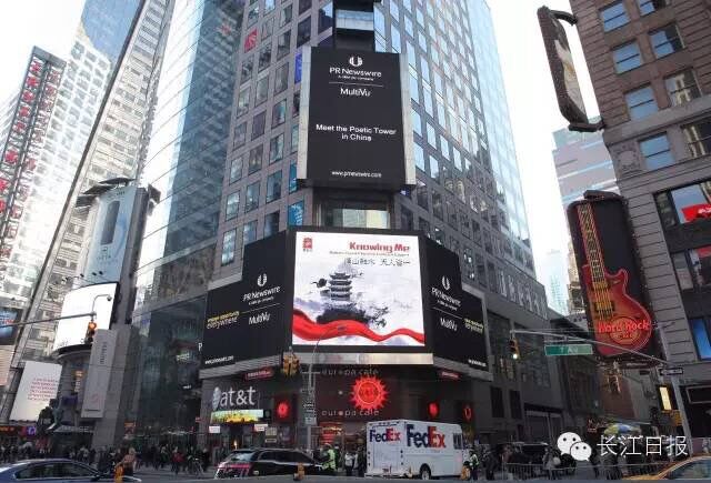 3月5日,紐約時代廣場最大電子屏幕——面積110平方米的湯森路透主屏上,出現(xiàn)了一幅中國風(fēng)的水墨黃鶴樓景區(qū)宣傳畫,它每隔3分鐘出現(xiàn)15秒,持續(xù)了一整天。