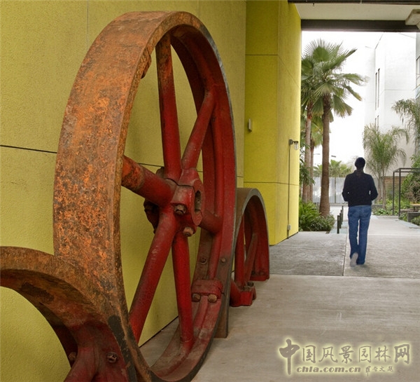 米勒公司在設計中還利用了罐頭工廠廢棄的機械裝置和其他的文物,喚醒了這片土地承載著的世紀之久的勞動歷史記憶。鐵輪——曾經是罐頭廠制冰機的一部分,如今作為工業雕塑擺在了西入口處。廢棄的開關面板也在項目中被重新利用,安裝在過道上。面對著花園庭院。