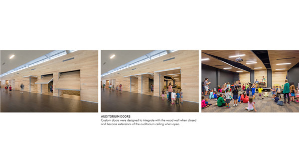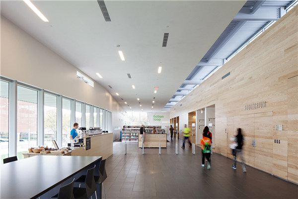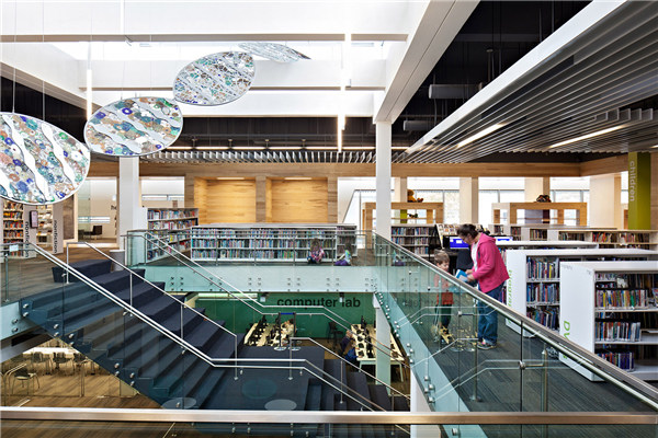 新增加的擴建部分簡單實用。就是在原來圖書館的周圍打造了一圈連續的閱覽室,將它變成了一個視野開闊的,以社區為中心的場所。每一個新的立面都朝向一個不同的區域:朝西是社區,朝北為郵局,東面是市區,而南面是一個新的廣場。設計師選擇了三個主要的建筑材料以保持相互之間的一致性,同時也讓游客能夠體驗到一種連續的效果。外墻采用了高性能陶瓷防雨材料。而室內使用了大量的玻璃表面,這讓圖書館內的每個角落都呈現出一種開放的姿態,白天的光線可以通過新的天窗照射到原來圖書館的核心區域。