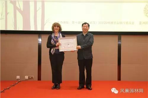 湖北省政府副秘書長王潤濤為法國景觀大師杰奎琳·奧斯蒂女士頒發建園紀念證書