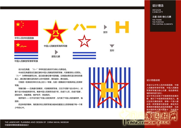 中央的五角星取自五星紅旗和中國人民解放軍軍徽,代表著黨和人民軍隊。“八一”為博物館建筑主體。藍白底紋象征著中國海疆。五角星坐落在藍白條紋的基底上,象征著閃耀在藍色海洋上的中國海軍,乘風破浪,勇往直前。