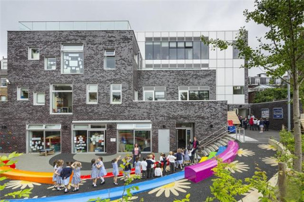 戶外教室、充滿生機的新型食用植物花園和運動場上“瓢浮”的五彩繽紛彩虹階梯成為了外部空間的焦點,也展示出了設計師們的創新設計。起初,師生們和當地社區都提出并共同探討了他們對該項目的希冀和愿景,從而最終形成了建造學校運動場最初的想法。參照大家的意見,B|D設計事務所創造了一個獨特的錯層運動場,在有限的場地內可以完成教學、玩耍、運動等多項活動。