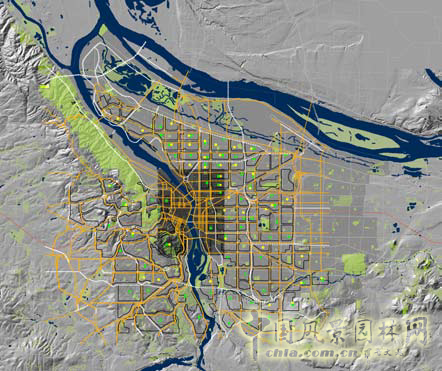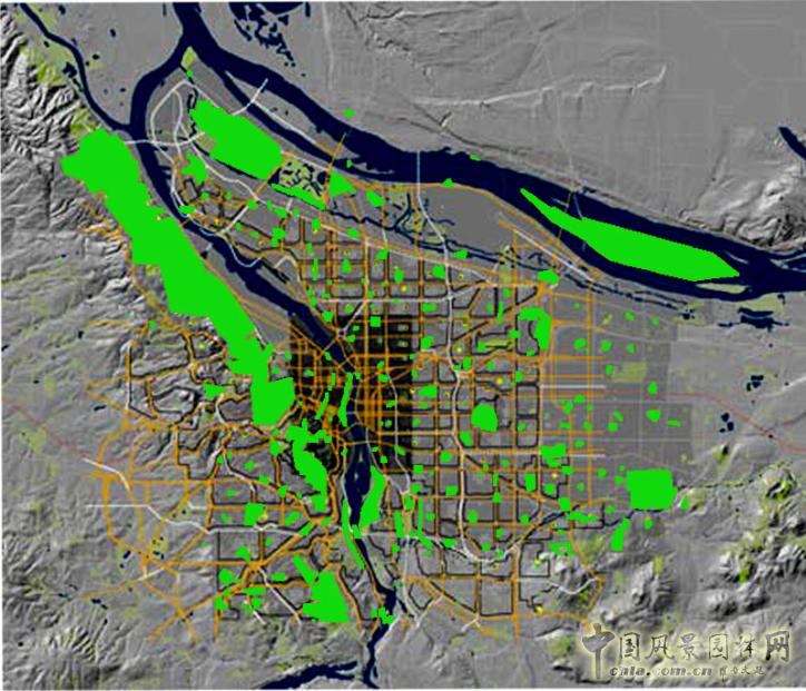 接下來要說的是綠色開放空間和城市生長的關系。集體經濟時代,我們過于注重規劃方面,對于城市自然環境的生長缺乏理解。下面的圖片是美國的波特蘭,圖一是1966年,圖二是2014年。兩張圖片的的對比是顯而易見的。波特蘭最早的規劃只有很小面積的一片城區,可是在當時就已經在考慮公園和道路系統的問題,并且已經明確提出建造工業系統的方針以及加強公共空間網絡的建設。到了2012年,就在原本簡單的網絡基礎上更加注重城市整體形象的設計,這個時候城市還沒有蔓延擴大,但已經有了綠化規劃。上世紀60年代,社區鄰里的概念發展起來,對原有的大網絡進行了一次修整。下面是波特蘭的今天,可以看出來波特蘭是一個綠色開放空間引導的城市。