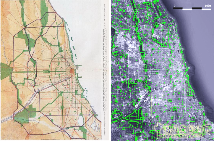 接下來是一個芝加哥的城市規(guī)劃,可以看出來城市規(guī)劃的連續(xù)性非常重要。一百多年前的芝加哥城市規(guī)劃,和今天的綠地布局幾乎是可以完全對上的。一百多年以來,整個城市的規(guī)劃設(shè)計非常連貫,在城市中看不到大的綠地,綠地的特點是小而多,這實際上是密集型城區(qū)非常重要的空間格局訴求。