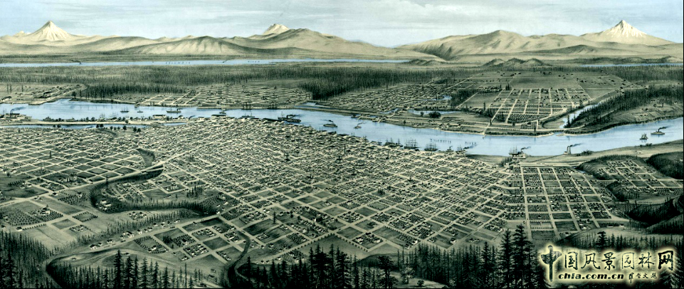第三個問題,我們回到波特蘭,波特蘭最初的時候,是有它的城市肌理的,所以城市很好被理解。而在早期,周圍其實就是自然山水。慢慢的這個城市在升高,但仍然保留著一點點關于宗教的建筑。再接下來,一個教堂都找不到,能看到的都是商業群,而在這個商業群里面可以看到歷史。