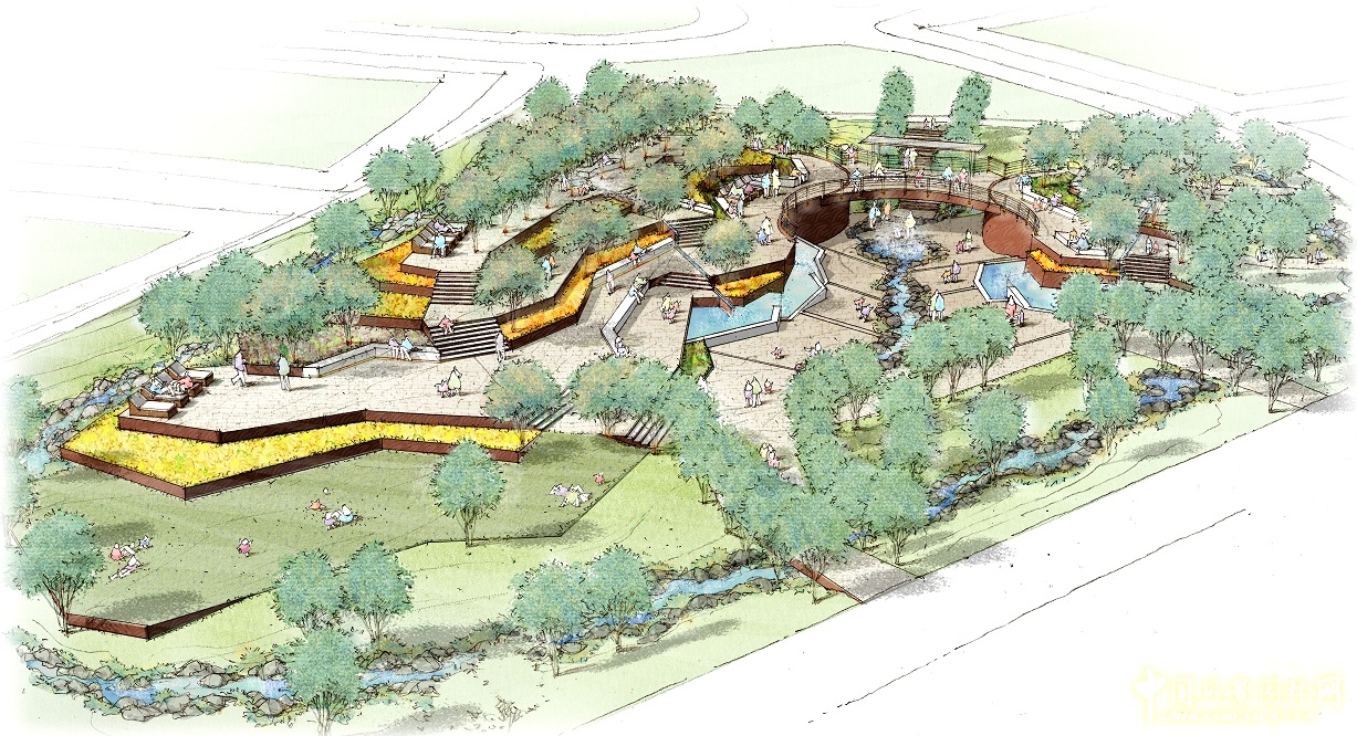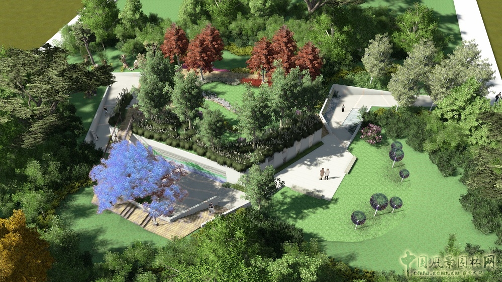 “生命之臺(tái)”取意于云南元陽梯田,構(gòu)筑梯臺(tái)空間,分別造“春霧平臺(tái)”“夏浪梯田”“秋收臺(tái)地”“冬霜森林”四景,南面環(huán)以小溪。