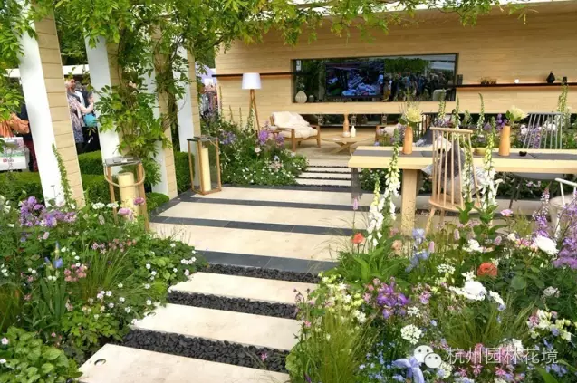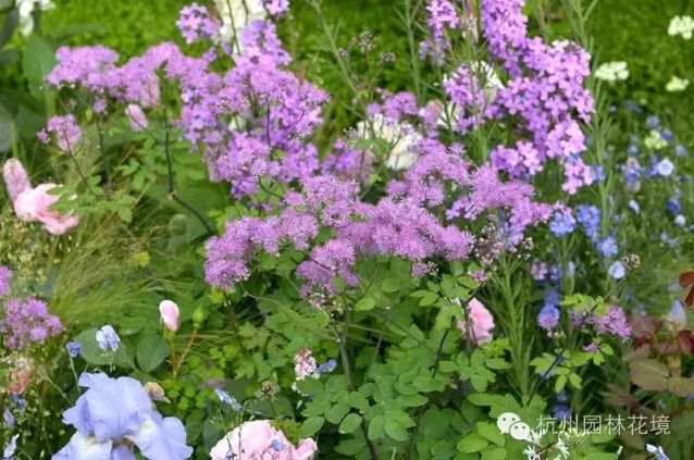 本屆花展共有17個展示花園(Show Garden),是眾多杰出設(shè)計師和園藝師共同奉獻(xiàn)的作品,花園主題仍是體現(xiàn)花卉品種的多樣、色彩的豐富。如英國怪伽園(The Harrods British Eccentrics Garden)雖以能電動起伏、旋轉(zhuǎn)的灌木球柱為創(chuàng)意,但吸引人們駐足的仍是其豐富的花卉色彩,花序聳立的獨(dú)尾草屬、蓍草屬、吊鐘柳屬、百子蓮屬、毛地黃屬植物混合配置,色彩斑斕,花叢林立。LG智能花園(The LG Smart Garden)以智能家具和科技生活為主題,強(qiáng)調(diào)花園也可融入科技智能,粉色系、紫色系的各類花卉營造清新閑適的氛圍,有這類色系月季、毛地黃、鳶尾、粉花蓼品種,甚至還有唐松草屬(Thalictrum)品種。
