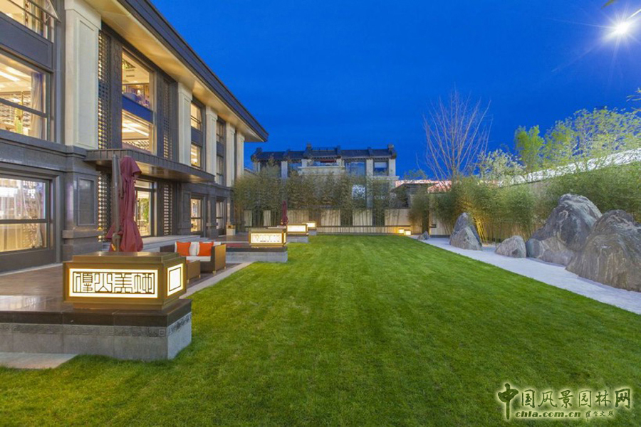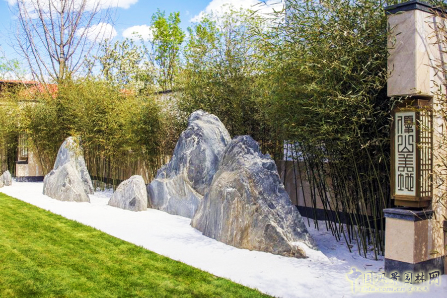 特選切片泰山石對景,開敞草坪、切片山石、白沙和青竹組成了意境深遠的山水畫卷;以傳統(tǒng)園林的空間序列設計及以小見大的景觀手法展現(xiàn)詩情畫意的現(xiàn)代空間之美。
