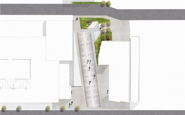 Public Media Commons創造了一個極富互動性的開放空間,藝術、教育和公共媒體在此交匯、相融??此破匠5墓矎V場空間內暗藏玄機,穿孔金屬薄板包裹著相鄰的兩座建筑,斑駁的表面肌理不僅統一了周邊環境的建筑語言,也成為各類新媒體一顯身手的最佳場所。北側的大屏幕上可以滾動播出實時節目,而西側的墻面則可在廣場舉辦活動時充當投影的幕布。小型表演舞臺、下沉式的臺階座椅、巨大的投影幕墻以及源自密蘇里州本土的草原景觀植物占據了廣場的不同角落,相輔相成的媒體與格局設計激活了廣場空間,也預示著未來城市空間設計必然的發展方向。