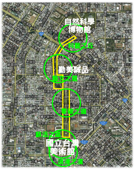 整體分為5個區(qū)段,包括科藝之丘(以科博館為核心)、藝文之心(以勤美誠品為核心)、零碳之道(公正路至民生路之間)、蘇活之區(qū)(以國美館為核心)以及浪漫之濱(以美術(shù)園道咖啡街為核心)。