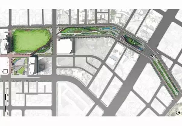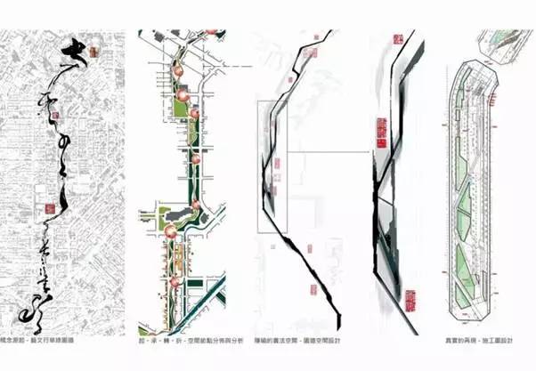 “草悟道”計劃以藝文行草綠園道的空間概念,圍繞中國書法的概念:透過筆劃般的速度、刻劃、力勁,隨帶狀空間布置的活動節(jié)點(diǎn),其活動強(qiáng)度及氛圍有濃有淡、有疏有密,如同書法的行草一般,顯露流暢的韻律,將創(chuàng)新、可持續(xù)性發(fā)展和娛樂休閑結(jié)合為一體,打造行云流水般的都會特色空間。