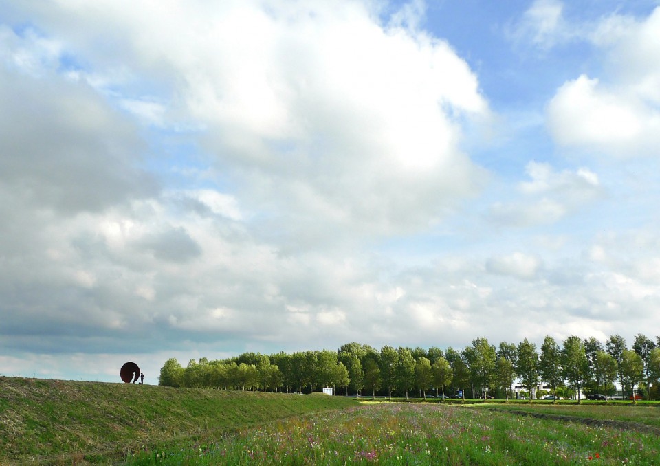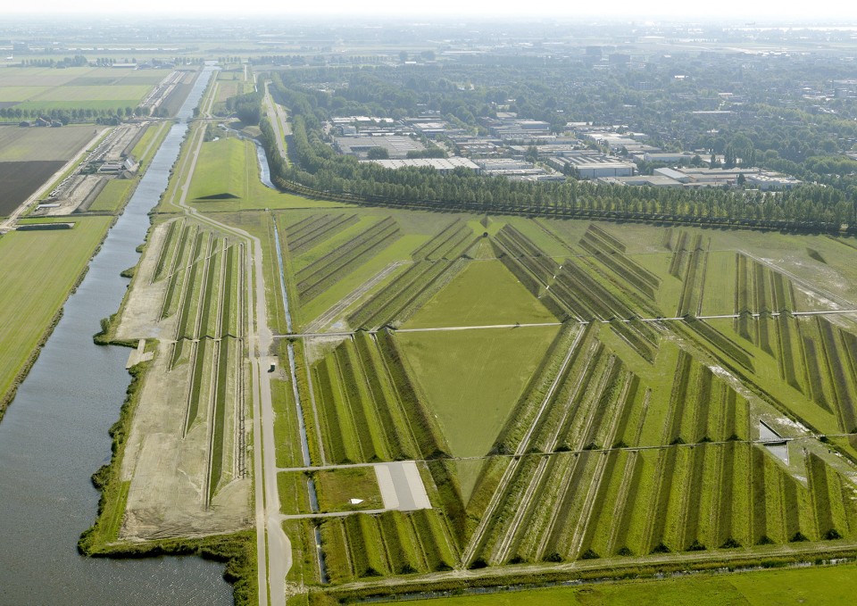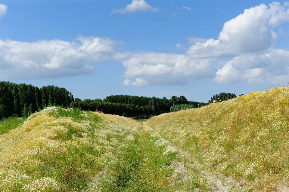 一道道3米高的矮堤環繞著中間的開闊空地而立,成為了除小小金字塔以外場地上唯一的立體元素。流暢的線條以及茂盛生長的植被讓矮堤完全融入了環境之中。而在中間,一條瀝青鋪設的自行車道與步行道穿越了公園。在矮堤之間,長滿了野草的小道縱橫交錯,搭建出充滿野趣的步行系統。