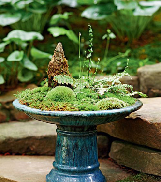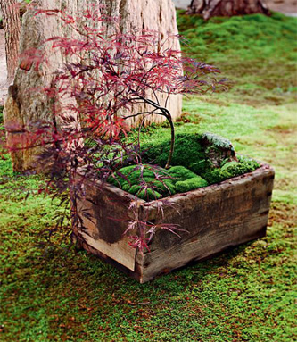 苔蘚盆景擺在露臺、木甲板上往往有非凡的表現,在花園中的表現也不弱,適合在玉簪、藜蘆叢中半隱半現。家里來客人的時候,把它們搬回室內展示會非常討人喜歡,給居室空間帶來綠意。室外的苔蘚盆景在明亮、非直接光照、有雨水滋潤的自然條件下會生長良好,因為這些都是苔蘚喜好的生長環境。如果花園里達不到類似的環境條件,只要重新為它們創造這樣的小的生長環境即可,盡量將苔蘚盆景放在樹下背陰處,或者懸掛于門廊上,堅持澆水、噴水霧以保持它們的活力。