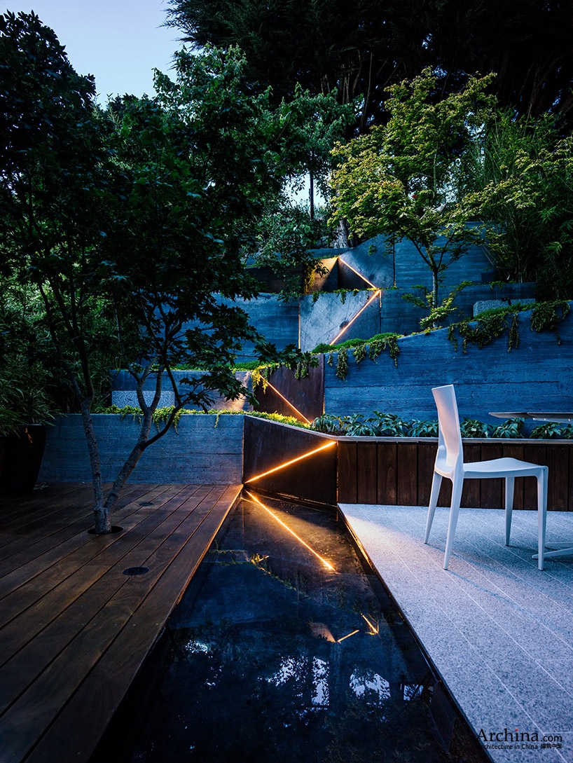 庭院400平方英尺的戶外活動空間是客廳的延伸,是一個“新”客廳。如鏡的水池倒映著美麗的日本楓樹,到了夜晚,藏在銹蝕鋼板中的折線燈從坡下串至坡上。坡頂的平臺可以欣賞到舊金山和東灣的美景。