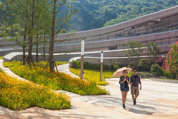 項目的景觀設計團隊是澳大利亞的HASSELL國際設計咨詢公司。他們設計了博物館入口的門戶廣場以及周邊的開敞園地。基于對場地現狀地勢的尊重,HASSELL團隊充分利用了場地原有的地勢條件,將各種活動空間,服務設施,交通設施和周邊園地無縫連接,最終形成了干凈清晰的流線型場地格局。
