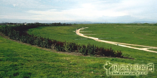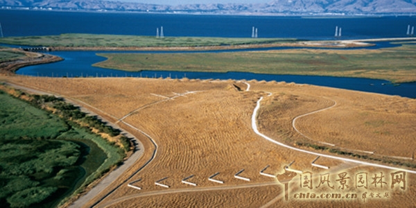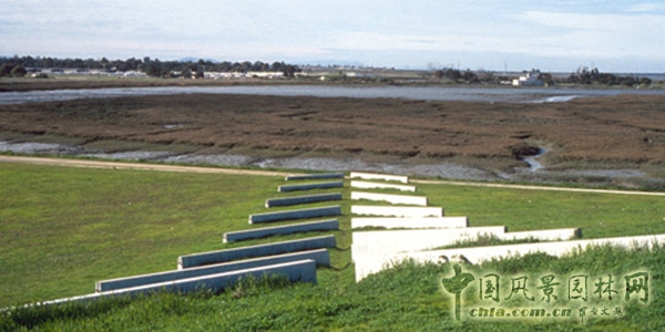 拜斯比(Byxbee)公園位于加州帕羅·奧托市(Palo Alto)的海邊,由大片自然草所覆蓋,每到雨季來臨,大片的荒草都轉化為蒼翠繁茂的綠色,呈現出一種難以刻意人工營造和名狀的壯觀和動人場景。在傾斜的地形上,風吹動著自然草地,誘人的流動引人走向山谷處的大地之門,在山坡處則用土丘群隱喻當年印第安人漁獵時就地填起的貝殼堆。