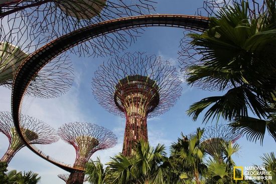 新加坡在這方面已經走在了前列,圖中這些名為“超級樹”的智能綠色植物可以吸收熱量,并提供樹蔭,從而有效控制城市溫度。這些樹實際上是復雜的垂直花園,由超過200種植物組成,頂上還加蓋了太陽能板。