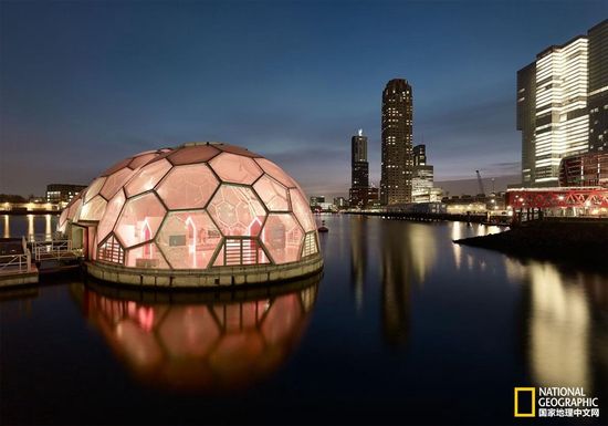 除了未來水世界里的休閑公園,鹿特丹還在積極尋求其他解決辦法。這座地勢低洼的港口城市正計劃修建水上居民區,而圖中的太陽能館則是第一步。它也是城市氣候變化應對計劃的展覽空間。
